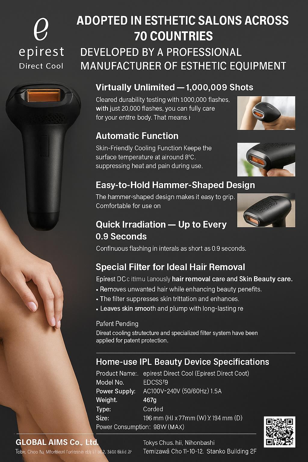 We are glad to introduce the EPIREST DIRECT COOL - the Beauty Device which is developed wiith the latest technology to minimize pain. This is hair removal device will make it possible for you to achive a smooth skin right at convenient of your home.